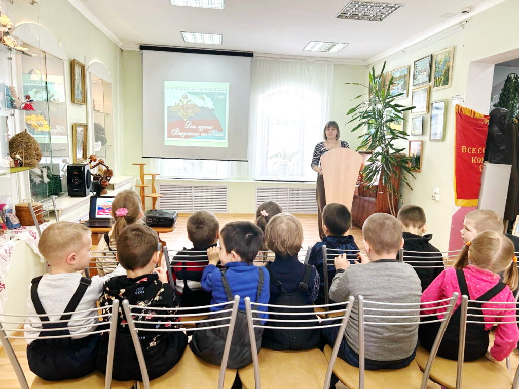 Ко Дню защитника Отечества в Тоншаевском краеведческом музее прошло интерактивное занятие «Твои защитники, Россия». Воспитанники МДОУ «Детский сад № 1 «Теремок» р.п. Тоншаево (воспитатели: Ирина Юрьевна Яковлева, Людмила Валентиновна Джурмий) узнали о том, кто такие защитники Отечества, познакомились с родами войск, узнали о военных профессиях и военной технике.Дети с удовольствием отгадывали загадки и участвовали в играх. Сотрудник музея Валерия Олеговна Мирянгина провела для юных гостей экскурсию по экспозиции «Нет ребят, я не гордый», где показала образцы военной формы и предметы быта солдат.